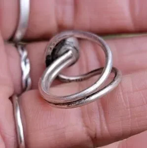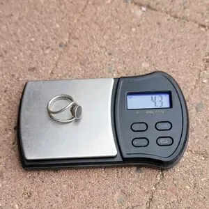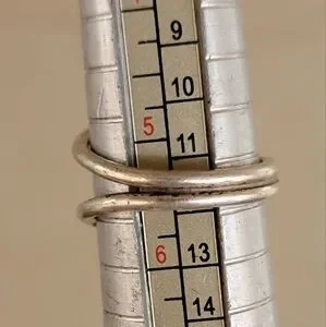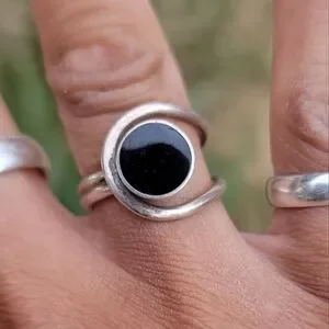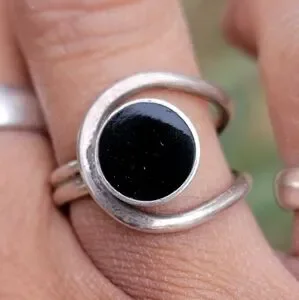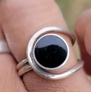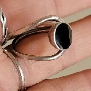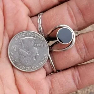 Wonderful modernist design with Southwestern vibes. Round inlay onyx with a round frame around it. Double band. Fits a size 5.25 - 5.5. Stamped "925 T-5 100." Natural, beautiful patina included. May need a cleaning depending on your preferences. Tested with a neodymium magnet and JSP acid, guaranteed sterling.