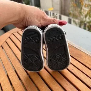 Classic Converse All Star high-top sneakers perfect for your little one's everyday adventures! These iconic black canvas shoes feature red accents and the signature white rubber toe cap. The slip-resistant sole provides great traction for active kids. Perfect for playground fun, casual outings, or matching with any outfit. The timeless design makes these sneakers a versatile addition to your child's wardrobe.