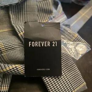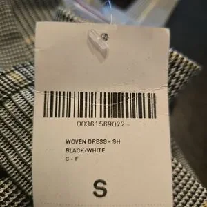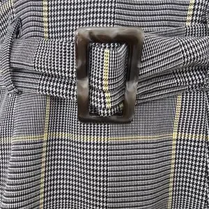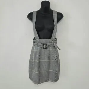 Jumper style. Lined. Black, white and yellow print. Belted at the waist. Shoulder strap length can be adjusted with buttons. Zips at the back.