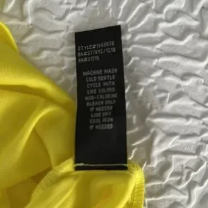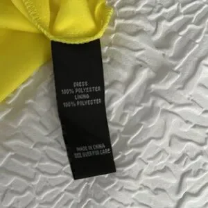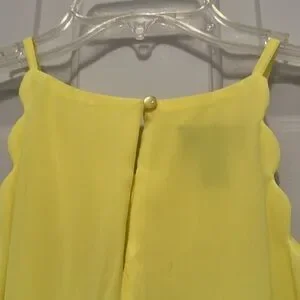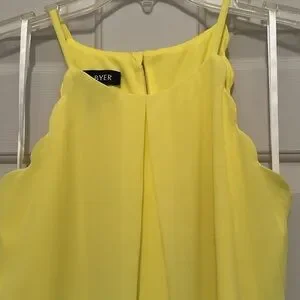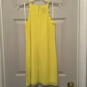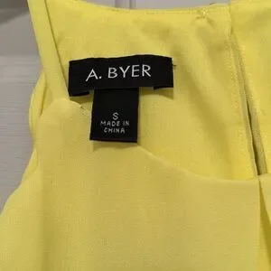 Cute yellow dress by A Byer. Size S Details: 28” long, 16” at armpit. Polyester chiffon and lined, spaghetti straps, scalloped edge armholes, front center pleat, back keyhole button closure. Machine washable cold. Worn once.