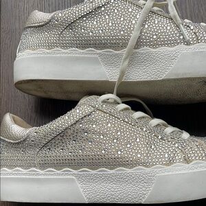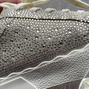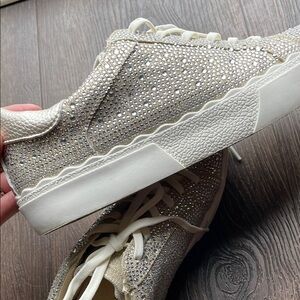 Size 8M Anne Klein gold rhinestone sneakers, featuring a shimmering textured design for a touch of glamour. Scalloped sole, thick elastic beige shoelaces. These low-top sneakers are crafted for comfort and versatility, making them perfect for any casual outing. Only worn once, too small for me!