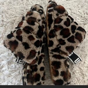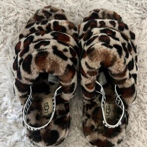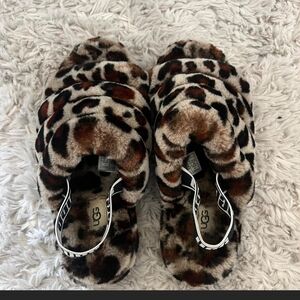 Cozy UGG slippers with a leopard print. Soft and plush material. Stylish and comfortable. Super clean, never actually worn. the material/ fuzz is in perfect condition!