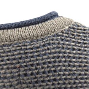 Perfect condition. No flaws. Just washed and layed out to dry. Very nice sweater. Thick. More fitted than loose. Vintage blue and tan.
