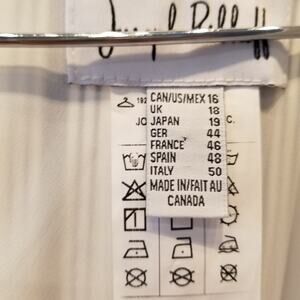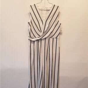 Joseph Ribkoff New Jumpsuit Sleeveless Black White Striped Cropped Plus Size 16. New with tags. High end Las Vegas Retailer inventory purchase. Sophisticated jumpsuit in ivory with black striping. The bodice is completely lined and the V neck twists into a faux wrap resembling a modern "half tuck". Invisible back zip, front slash pockets (yay!) and a 21" cropped leg inseam that will hit well above the ankle. Perfect for a summer party, rehearsal dinner, graduation or anniversary party. Cold water wash.Measures laid flat apprix. 22 inches chest, 19 waist, 23 hips, 52 length. Retail Price $299. Plus Size 16.