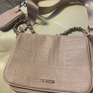 This stylish crossbody bag from Steve Madden features a beautiful pink hue and a sophisticated embossed texture. Its structured design and silver-toned chain strap add a touch of elegance, making it a perfect accessory for any occasion. You will get compliments.! Comes with change purse.