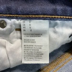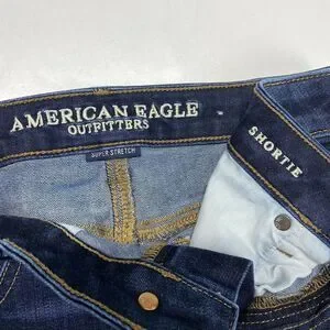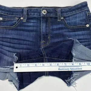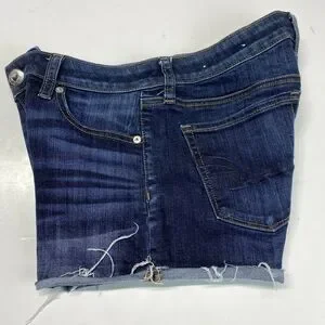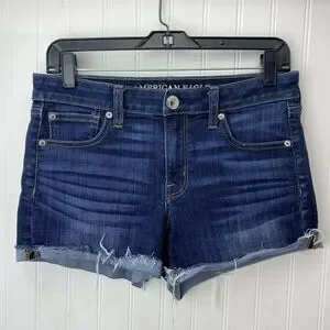 American Eagle Shortie (Tag Size 8) Womens Midrise Super Stretch Denim Blue Jean Short Shorts Dark Wash Raw Hem Fray EUC
