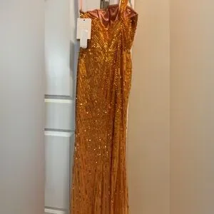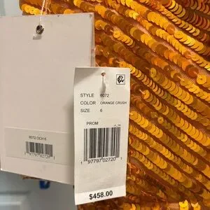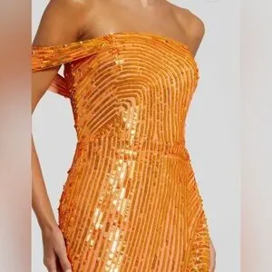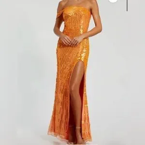 NWT Mac Duggal One Shoulder Mesh Sequin Gown w/Slit in Orange Crush Size 6