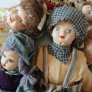 Unbranded, porcelain face doll collection. Ranging from 5 inches tall to 10 inches tall. Some have movable limbs. No stains. Good condition, used.