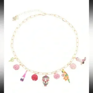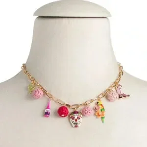 Refined paper clip chain necklace featuring vibrant mixed charms at front including sugar skull, parrot with tropical flowers, cowgirl boot, cactus and crochet beads. Necklace has an adjustable lobster clasp closure. Made from metal, acrylic, enamel, thread and glass.
