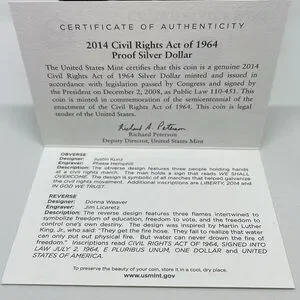 2014 Civil Rights Act of 1964 Proof Silver Dollar with COA