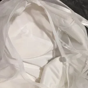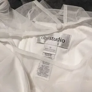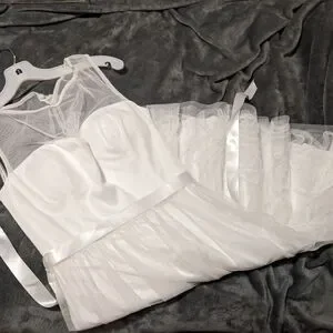 Stunning David's bridal midi wedding dress. White with satin ties, gauze/lace overlay and floral lace bottom. built-in bra added and beautiful fabric covered button closure at back. Size 12, never worn
