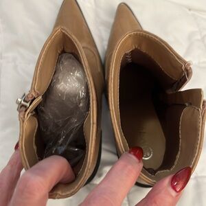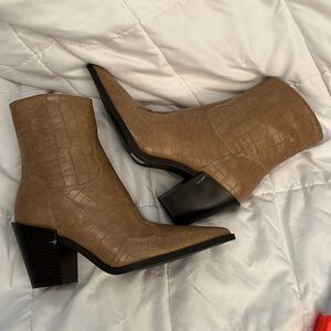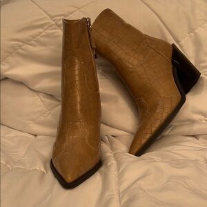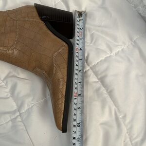 Step out in style with these chic tan croc-embossed ankle boots. Perfect for any occasion, these boots offer both comfort and elegance. ordered online the heels were scuffed as you could see pictures, gorgeous boots very comfortable nice block Hill cowgirl inspired very comfortable size 39
