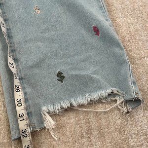 Blue high rise / high waist straight leg embroidered jeans. Denim does not have stretch
