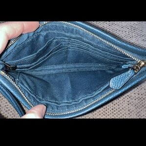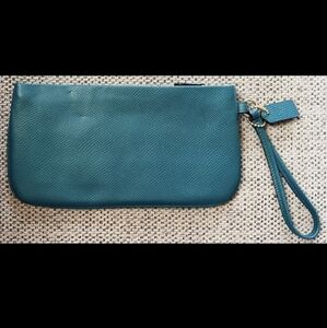 This Coach pouch wristlet doubles as a wallet with 6 card slots and an additional inner slide pocket for bills or loose change. At 9" by 5" it will also fit many cell phones (please measure yours to be sure). It's larger than most Coach wristlets which are only 6" wide so it's quite functional. Zip top and clutch / wrist strap with hang tag. The. color is a rich teal (turquoise, aqua, or peacock - very marine and beachy. It's not identical to my Atlantic Blue bag but pretty close). Ships immediately from smoke-free home.