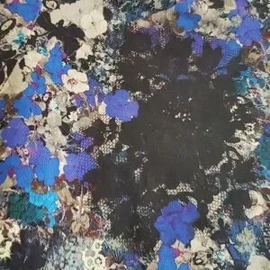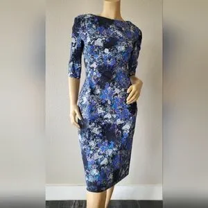 POWER MESH FULLY LINED STRUCTURED TAILORED AT OR BELOW KNEE 3/4 SLEEVE LUXURY DRESS IN VIBRANT BLUE FLORAL DESIGN.