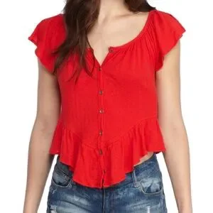 This striking red top from Free People showcases a delightful ruffled design with a peplum hem, offering a playful and stylish silhouette. The buttoned front enhances its charm, making it a perfect choice for both casual and dressy occasions.