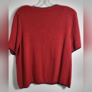 Red with black trim, button up sweater top, short sleeves, shoulder padding, v-neck, cropped, women's XL