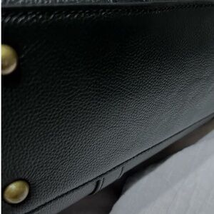 The perfect size for an everyday bag! Gorgeous black leather studded satchel with handles. Antiqued gold tone hardware, rolled handles, interior card slots, zip closure at top on each side, protective studs at base! ( the cross body strap may not be the original ( it could be though ) however it is solid and in perfect condition)