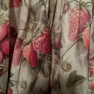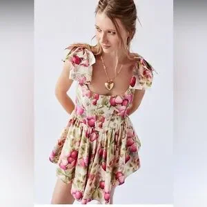 Charming floral dress by Free People. Features a vibrant strawberry pattern. Perfect for summer outings. This dress is femme and flirty.