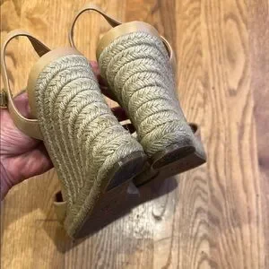 Step out in style with these chic tan leather and jute espadrille wedge sandals. Perfect for any occasion, these sandals offer both comfort and elegance. Good used condition.