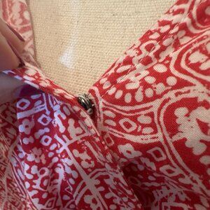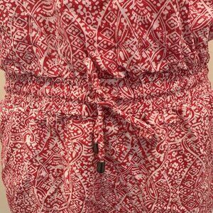 Splendid red and white print shorts romper in women’s size medium. Has a flattering elastic and drawstring waist with spaghetti strap top. V-neck wrap look with an extra snap at the chest to stay closed.