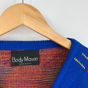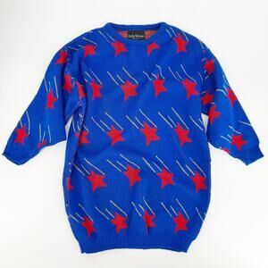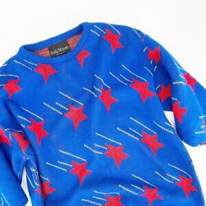 Vintage Body Maven oversized sweater dress featuring a vibrant royal blue knit with an allover red shooting star pattern. Slouchy, relaxed fit and 3/4 sleeves give it that effortlessly cool grunge, indie, and Y2K aesthetic. Perfect for layering over tights or styling as an oversized sweater with jeans. Made in the USA.
