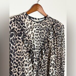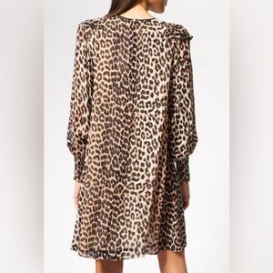 Embrace your wild side with this chic leopard print dress. Leopard print 'Mullin' mini dress from Copenhagen-based label, Ganni. Crafted from lightweight, fluid Georgette fabric with a partial lining and semi sheer long sleeves. The dress is accentuated with a round neckline, a V-shaped ruffle trim and elasticated smocked sleeves. A concealed rear zip fastening completes the design.