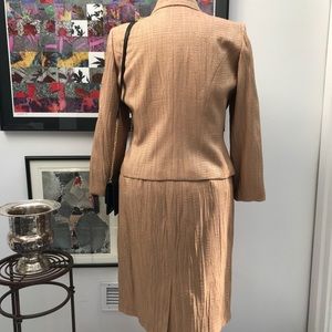 KASPER Skirt Suit in tan textured Rayon / Poly blend. Covered buttons, very slim and comfortable narrow waistband. Dry Clean Only.