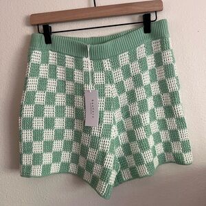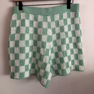 Super cute and cozy green and white checkered knit shorts from BaeVely! These shorts feature a soft, breathable waffle knit texture with a stretchy ribbed waistband for a comfortable fit. Perfect for lounging or styling with a cute crop top for a casual, trendy look.