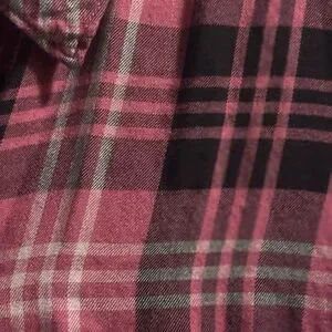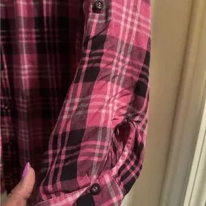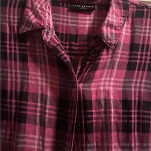 Stylish pink plaid shirt by Lane Bryant. Features a classic collar and button-down front. Perfect for casual outings.