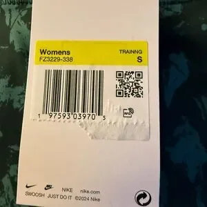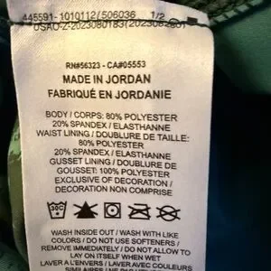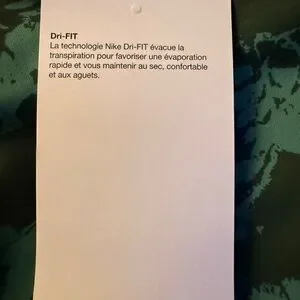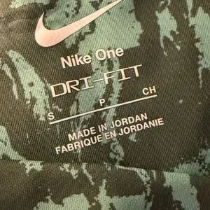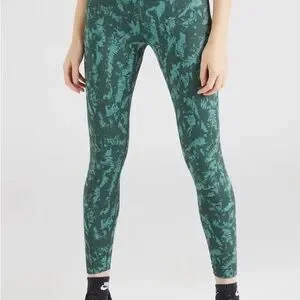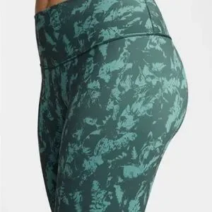 Nike One Printed High Rise 7/8 Leggings in size Large feature a green pattern design. These activewear leggings are made of a polyester-spandex blend with moisture-wicking properties for comfort during activities like gym training, yoga, and dance. They have an elastic waist, pockets, and offer stretch for ease of movement. The leggings are machine washable and have an ankle length style. Perfect for women who prioritize both style and functionality in their activewear.