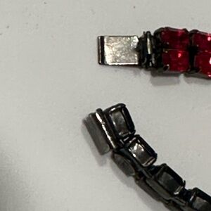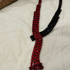 Art Deco Cranberry Garnet & Black Glass Crystal Collar Necklace This is a stunning vintage Art Deco-inspired rhinestone necklace. The necklace features an intricate geometric design that showcases a combination of sparkling, high-quality rhinestones, meticulously arranged to catch the light beautifully. The centerpiece includes a cascading red garnet teardrop stones, adding an elegant focal point to the piece.