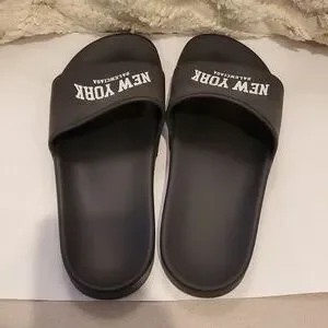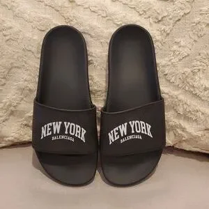 Stylish authentic BALENCIAGA cities logo pool slides. Features 'New York' text. Size 9 womens. Comfortable and trendy. Like new with no wear to the soles.
