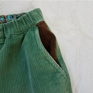 In excellent condition, front pockets lined with brown suede, green corduroy, back button pocket, elastic waist, outdoor collection, size large.