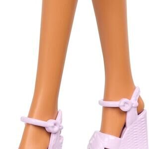 She wears a satiny pink blouse and sparkly, ruffled skirt made with a fun-to-touch fabric! Strappy lavender heels add an extra note of style savviness to her sweet look.