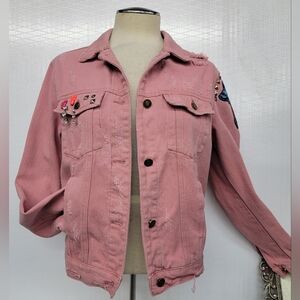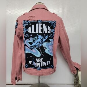Pink Jean Jacket with Alien Graphics Upcycled Retro