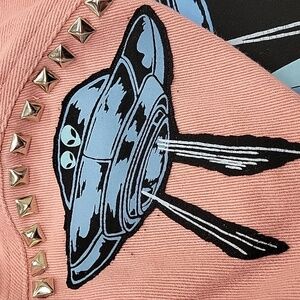 Stylish Pink Denim Jean Jacket Upcycled With Bold Alien Graphics by Vamp Designs.