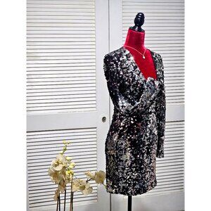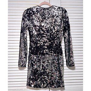This dazzling Rachel Zoe mini dress is a stunning display of elegance and glamour. Adorned with silver and black sequins, it features a striking V-neckline and long sleeves, creating a timeless silhouette. Ideal for evening wear or special occasions, this dress combines sophisticated design with radiant shine to leave a lasting impression.