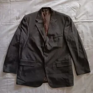 This is an Oscar De La Renta sportcoat in a very nice dark grey. There isn't a build/ size tag on this jacket, please see the measurements below. I only found 1 tiny flaw on the inside of the jacket lining. It's small please see pictures.