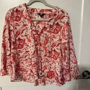 This vibrant red and white blouse features a stylish tie front and a relaxed fit, making it perfect for casual occasions. The V-neck design and 3/4 sleeves add a touch of elegance, while the mandarin collar enhances its unique style.