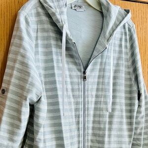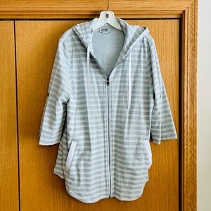 NEW ~ Comfortable & stylish hoodie jacket. Features a zip-up front & hood. Perfect for casual wear, beach coverup, outdoor activities, etc. Two (2) front pockets, 3/4 length sleeves with option to roll up with button strap, slightly tapered hem, 29.5 inches long (shoulder to hem). Bought at high-end clothing shop. Never worn. Excellent condition. Smoke free & pet free home.