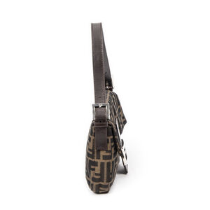 Fendi Shoulder Bag Baguette in Khaki/Dark Brown Zucca Canvas and Silver hardware. The product is in Excellent Condition (A).