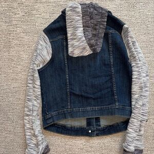 Cute denim jacket with knit sleeves & hood! Size Large Torrid size 00. Sits at waist. Length in photo. No rips or stains. Buttons function. Non smoking home