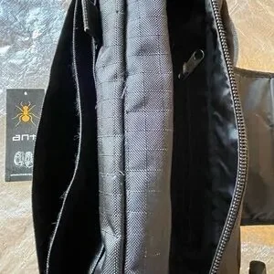 Has industrial velcro, Quality zippers, Comfort shoulder pad. Latch and all zippers intact and work great! It does not have a waistband.