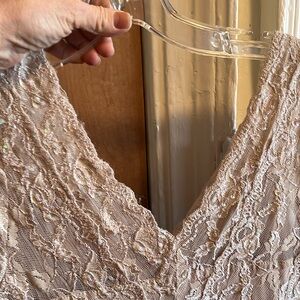 Beige stretch lace tiered V front and back with iridescent sequins. Tiny cap sleeves, empire waist. Ruched bodice, slim skirt. So cute. A few snags on lace.