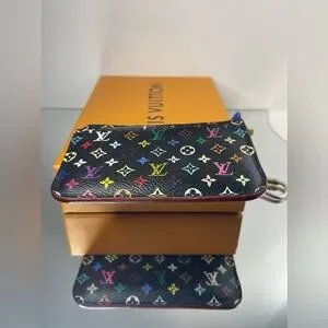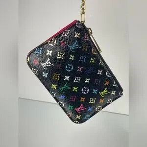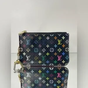 This Louis Vuitton pouch features a vibrant multicolor monogram on a sleek black background. Perfect for adding a touch of luxury to your everyday essentials.