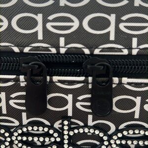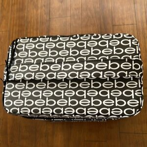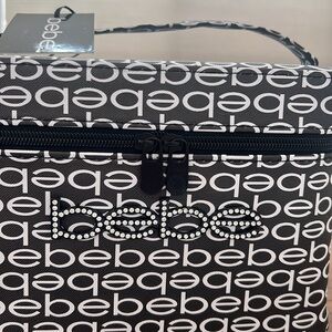 ADORABLE BEBE NWT MAKEUP TRAIN CASE. BEBE RHINESTONE RAISED INITIALS IN FRONT. 2 zippers in front go all the way around to back. Carry handle on top. Bebe initials on case itself too.