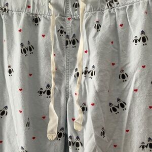 J screw pajama pants, size large in blue with cute penguin design, drawstring waist, 200% cotton, waist 35”, inseam 29” and rise 9”, soft and comfy