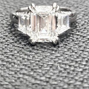This custom designed stunning emerald cut lab diamond platinum ring features beautifully cut 3.01 center certified EVS1 center diamond with E color VS1 trapezoid side diamonds. Nearly 4 carats tw. Finger size 5.25
