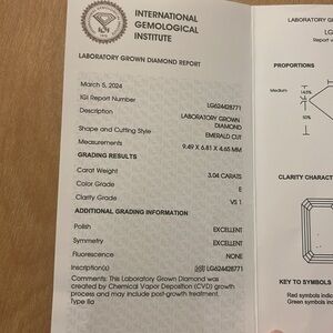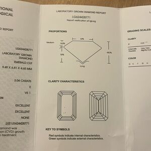 • the fluorescence, table %, depth %, and girdle thickness — these affect brilliance and value.